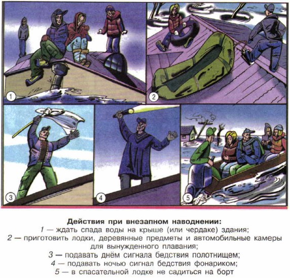 Глава 4. Чрезвычайные ситуации гидрологического происхождения Рекомендации населению по действиям при угрозе и во время наводнения. ОБЖСамостоятельно из затопленного района выбираться можно лишь в безвыходных ситуациях — когда одному из пострадавших нужна медицинская помощь, когда вода всё поднимается и нет никакой надежды на спасателей.