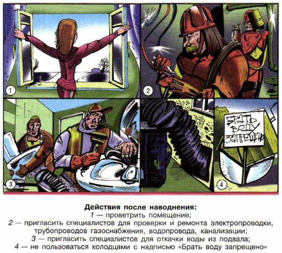 Выбираясь из зоны затопления самостоятельно, не прекращайте подавать сигналы бедствия. Как действовать после наводненияБудьте осмотрительны перед тем, как войти в здание: вам может угрожать обрушение или падение какого-либо предмета. Проветрите помещение (для удаления накопившихся газов). Дождитесь проверки исправности электропроводки, трубопроводов газоснабжения, водопровода и канализации. Для просушивания помещений откройте все двери и окна, уберите грязь с пола и стен, откачайте воду из подвалов. Не употребляйте в пищу продукты, которые были в контакте с водой. Не пользуйтесь водой из колодцев, пока они не будут очищены.