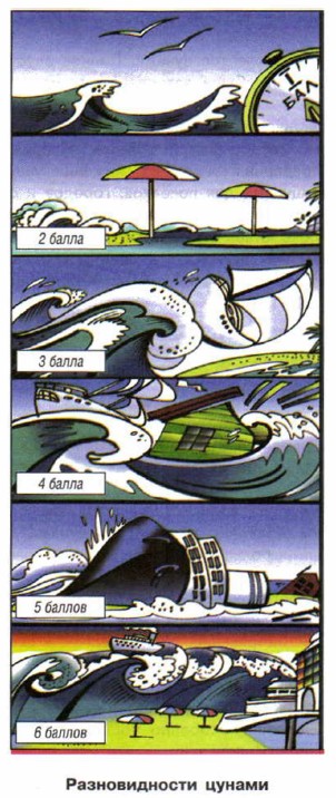 1 балл — цунами очень слабое, волна регистрируется только специальными приборами (мореографами). 2 балла — слабое цунами, может затопить плоское побережье. Его замечают только специалисты. 3 балла — среднее цунами, отмечается всеми. Плоское побережье затоплено, лёгкие суда могут быть выброшены на берег, портовые сооружения подвергнуты слабым разрушениям. 4 балла — сильное цунами. Побережье затоплено. Прибрежные по- 106 стройки повреждены, имеют слабые и сильные разрушения. Крупные парусные и небольшие моторные суда выброшены на сушу, а затем снова смыты в море. Берега засорены песком, илом, обломками деревьев, возможны человеческие жертвы.