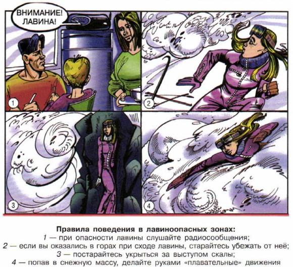 При сходе лавины, если от вас до неё есть приличное расстояние, необходимо ускоренным шагом или бегом уйти с пути лавины в безопасное место или укрыться за выступом скалы, в выемке. Если от лавины невозможно уйти, избавьтесь от всех вещей и примите горизонтальное положение; прикройте варежкой или шарфом рот и нос, чтобы не задохнуться; в снежной массе двигайте руками и ногами (изображайте плавание), чтобы остаться на поверхности; попытайтесь расчистить слой снега перед собой для облегчения дыхания. Когда лавина остановилась, постарайтесь двигаться вверх. Не теряйте самообладания, не засыпайте, экономьте силы, помните, что вас ищут (известны случаи, когда из-под лавины спасали людей на пятые и даже на тринадцатые сутки).