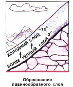 Глава 4. Чрезвычайные ситуации гидрологического происхождения Снежные лавиныЛавина — быстрое, внезапно возникающее движение снега и (или) льда вниз по крутым склонам гор, представляющее угрозу жизни и здоровью людей, наносящее ущерб объектам экономики и окружающей среде. Лавины образуются на безлесных склонах гор, угол наклона которых больше 14°. Это критический наклон, при котором снег постоянно сползает вниз. Сход лавины начинается при слое свежевыпавшего снега 30 см или при толщине старого снега более 70 см. Крутизна склона, наиболее благоприятная для образования лавины, составляет 30—40°.