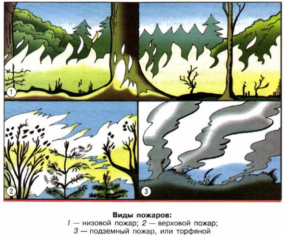 Лесные пожары при сухой и ветреной погоде могут охватывать значительные территории. При жаркой погоде, если дождей не было в течение 2—3 недель, лес становится очень сухим и пожароопасным. В это время любое неосторожное обращение с огнём в лесу (брошенный окурок, незатушенный костёр и т. д.) может вызвать пожар, который быстро распространится по лесной территории. Установлено, что до 80% лесных пожаров связано с жизнедеятельностью человека — с нарушением населением мер пожарной безопасности в лесной зоне. В отдельных районах Сибири и Дальнего Востока в весенний период основной причиной возникновения лесных пожаров являются палы, которые проводятся на сельскохозяйственных угодьях для уничтожения на полях прошлогодней сухой травы и обогащения почвы золой. В весеннее время лесные пожары часто возникают в районах лесозаготовок при очистке лесосек «огневым способом» (сжиганием порубочных остатков). В середине лета значительное число пожаров возникает в период сбора ягод и грибов, когда люди особенно часто бывают в лесу. Отмечено, что возникновение лесных пожаров имеет определённую сезонность. Поэтому выделяют пожароопасный сезон. Пожароопасный сезон — это период времени года с момента таяния снегового покрова в лесу до наступления устойчивой дождливой осенней погоды или образования снегового покрова. В общей сложности пожароопасный сезон длится с апреля по ноябрь. Пожароопасный сезон разделяют на пожароопасные периоды и периоды отсутствия пожарной опасности. Период, в который выпадает более 3 мм осадков, считается непожароопасным. Наиболее пожароопасным периодом считается июль — август. Классификация лесных пожаров осуществляется в зависимости от характера возгорания, скорости распространения пожара и размера площади, охваченной огнём. В зависимости от характера возгорания и состава леса пожары подразделяются на низовые, верховые и подземные, или торфяные. Низовой пожар — это лесной пожар, распространяющийся по нижним ярусам лесной растительности, лесной подстилке, опавшим листьям и веткам деревьев и валежника. Почти все пожары в начале развития носят характер низовых и при определённых условиях переходят в верховые и подземные.