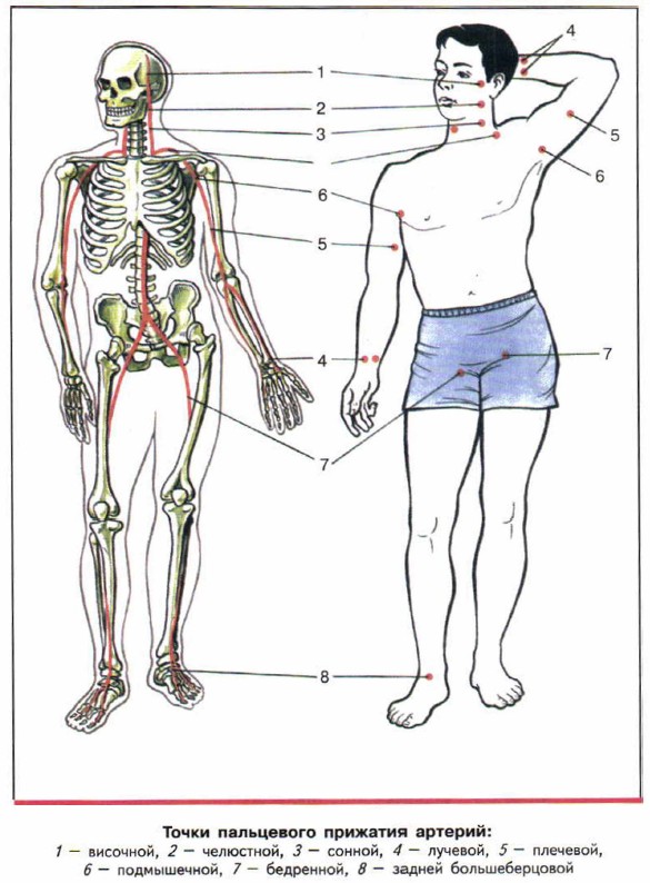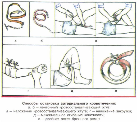 Существует много точек пальцевого прижатия артерий, вам надо запомнить две основные: плечевую и бедренную. Используется ещё один способ остановки артериального кровотечения — наложение жгута. Жгут накладывается на конечность примерно на 5 см выше повреждённой части. Жгут не накладывают на голое тело, так как это может привести к повреждению тканей. В качестве жгута можно использовать широкую полосу материи типа сложенной в несколько раз треугольной повязки, которая оборачивается дважды вокруг конечности.