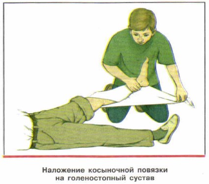При отсутствии бинта временную повязку на голеностопный сустав можно наложить с помощью косынки. Для этого размещают косынку так, чтобы двумя её концами можно было обернуть средний отдел стопы с подошвы на тыльную поверхность и третий завернуть через пятку на голень. Затем два конца, выведенные на тыл стопы, перекрещивают на передней поверхности голеностопного сустава чуть выше лодыжек. Предварительно третий конец косынки, которым обёрнута пятка, расправляют на боковых поверхностях сустава. Для закрепления повязки два перекрещенных конца косынки оборачивают в надлодыжечной области вокруг голени и завязывают. При необходимости третий конец косынки подтягивают вверх и расправляют складки. Как правило, при травме голеностопного сустава из бинтовых повязок отдают предпочтение восьмиобразной повязке, так как она даёт возможность хорошо закрыть голеностопный сустав со всех сторон и не сползает при движениях. Первый фиксирующий ход бинта делают выше лодыжки (1), далее вниз на подошву (2) и вокруг стопы (3). Затем бинт ведут по тыльной стороне стопы (4) выше лодыжки и возвращаются (5) на стопу, затем на лодыжку (6). Закрепляют конец бинта круговыми ходами (7 и 8) выше лодыжки.