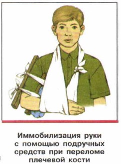 Глава 8. Первая помощь при неотложных состояниях Оказание первой помощи при ушибах и переломахОбщие правила оказания первой помощи при ушибахУшиб — это механическое повреждение мягких тканей без видимого нарушения целостности кожи. Ушиб возникает при ударе тупым предметом или при падении с небольшой высоты на плоскую поверхность. При ушибе обычно повреждаются мелкие кровеносные сосуды, в результате развивается внутритканевое кровоизлияние. Появляются боли в ушибленном месте, образуется кровоподтёк, припухлость, может произойти нарушение функции ушибленного органа и развитие травматического отёка. Если нет подозрения на перелом костей, на ушибленное место необходимо наложить давящую повязку. Для наложения повязки ушибленную конечность приподнимают. Затем к ушибленному месту прикладывают холод (пузырь со льдом) или делают холодные примочки (при этом через каждые 1—2 мин нагревшиеся салфетки необходимо менять). Если на коже в месте ушиба есть ссадины, то в этом случае не следует мочить ушибленное место, а сначала его надо обработать антисептиком и перевязать стерильным материалом и только тогда положить сверху пузырь со льдом, снегом или холодной водой. Потом ушибленной части тела обеспечивают неподвижность (ушибленную руку необходимо подвесить на перевязь, а ушибленной ноге придать горизонтальное положение). После этого пострадавшему обеспечивают покой и дают тёплое питьё. Общие правили оказания первой помощи при переломах конечностейПерелом — это нарушение целостности кости. Перелом может быть полным и неполным. При неполном переломе в кости образуется трещина. Переломы бывают открытые и закрытые. Для открытого перелома характерно наличие раны. Любое повреждение мягких тканей в области предполагаемого перелома является свидетельством открытого перелома. При закрытом переломе кожный покров остаётся неповреждённым. Открытый перелом более опасен, так как существует риск потери крови или занесения инфекции в рану. Первая помощь при переломах является началом их лечения.
