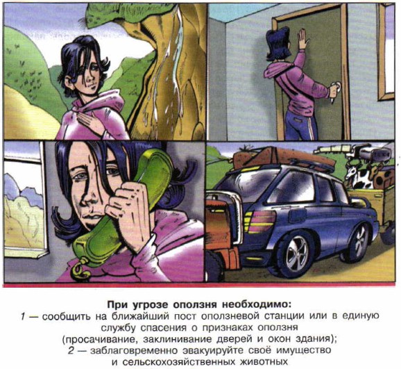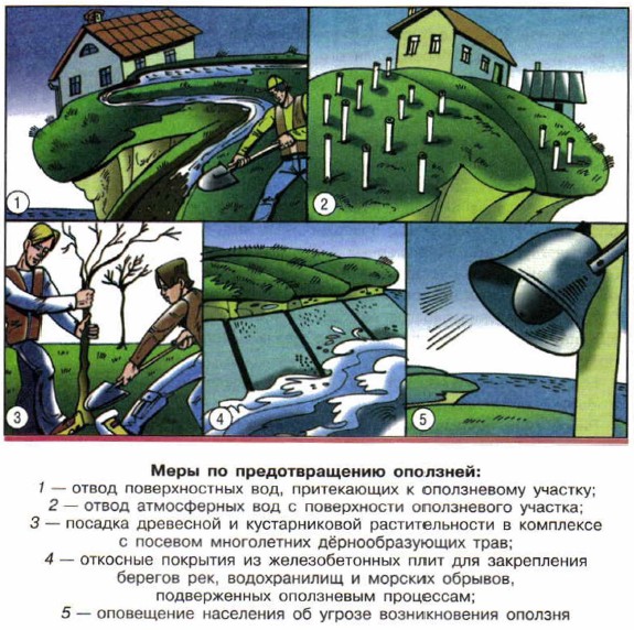 Для организации защиты населения от последствий оползней организуется контроль над оползнями и их прогноз. Установлено, что большую часть потенциальных оползней можно предотвратить, если своевременно принять меры в начальной стадии их развития. К противооползневым мероприятиям относятся: отвод поверхностных вод, притекающих к оползневому участку; отвод атмосферных вод с поверхности оползневого участка; посадка деревьев и кустарников в комплексе с посевом многолетних дёр- нообразующих трав на поверхности оползневых склонов. Для закрепления берегов рек, водохранилищ и морских обрывов, подверженных оползневым процессам, применяют откосные покрытия из железобетонных плит. Если оползень нельзя предотвратить, то население оповещают об угрозе, организуется эвакуация. Рассмотрим рекомендации специалистов МЧС России населению по действиям при угрозе возникновения оползня. Изучите информацию о возможных местах и примерных границах оползней, запомните сигналы оповещения об угрозе возникновения оползня, а также порядок действий при получении этого сигнала. Признаками надвигающегося оползня являются заклинивание дверей и окон зданий, просачивание воды на оползневых склонах. При появлении признаков приближающегося оползня сообщите на ближайший пост оползневой станции, ждите оттуда информацию, а сами действуйте в зависимости от обстановки. При угрозе оползня при наличии времени организуется заблаговременная эвакуация населения, сельскохозяйственных животных и имущества из угрожающих зон в безопасные места. При получении сигналов об угрозе возникновения оползня отключите электроприборы, газовые приборы и водопроводную сеть, приготовьтесь к немедленной эвакуации. В зависимости от выявленной оползневой станцией скорости смещения оползня действуйте, сообразуясь с угрозой. При скорости смещения оползня более 1,5 м в сутки (быстрое смещение) эвакуируйтесь в соответствии с заранее составленным планом. При эвакуации берите с собой документы, ценности, а в зависимости от обстановки и указаний администрации — тёплые вещи и продукты.
