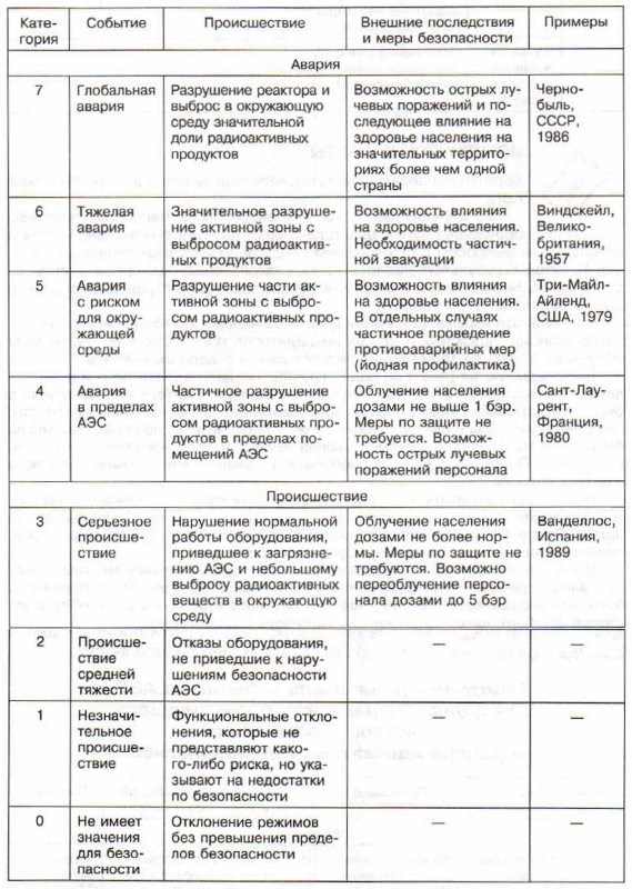 Международное агентство по атомной энергетике (МАГАТЭ) разработало специальную шкалу классификации тяжести аварий на АЭС. Шкала имеет 7 категорий тяжести последствий аварий и происшествий на АЭС и предназначена для оценки серьезности происшедшего, быстрого оповещения и выбора адекватных мер безопасности.