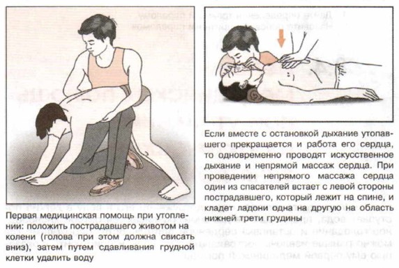 затем путем сдавливания грудной клетки удалить воду, попавшую в легкие и желудок. Если у пострадавшего отсутствует дыхание, то после удаления воды необходимо немедленно приступить к проведению искусственного дыхания.