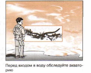 Если вы решили искупаться в незнакомом водоеме, то необходимо вначале тщательно обследовать берег и убедиться, что место, выбранное для купания, находится на песчаном берегу с хорошим спуском. Прежде чем войти в воду, нужно внимательно обследовать акваторию, примыкающую к берегу: не торчат ли из воды коряги, не притаились ли на дне топляки. Дно должно иметь постепенный уклон без ям, уступов, водорослей, острых камней, стекла и других опасных предметов. Нужно присмотреться к воде. Если она не спокойна, значит, здесь могут оказаться подводные ямы, ключи, густые водоросли.