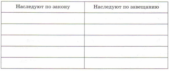 Наследник имеет право отказаться от наследства. Это можно сделать в пользу кого-либо из наследников либо без указания конкретных лиц. Если же наследник умирает после смерти наследодателя, так и не успев принять наследство, то право на его принятие переходит к его собственным наследникам. Принятием наследства могут считаться действия, связанные с фактическим его принятием. Например, владение имуществом (проживание в доме или квартире умершего; пользование его вещами). Кроме того, человек мог оплачивать содержание наследственного имущества, возвращать долги умершего или защищать его имущество от посягательств других лиц. Основные термины и понятия Наследование, наследодатель, наследник, завещание, право на обязательную долю в наследстве, время открытия наследства, место открытия наследства. Вопросы и задания 1. Объясните, в чём основная задача такой функции, как наследование. 2. В каких случаях в силу вступает наследственное право? 3. В каком случае вступает в силу право наследования по закону? Что такое очереди призвания к наследованию? Перечислите их. 4. За какой срок необходимо принять наследство? Где и как это можно сделать? Практикум 1. Заполните таблицу, соблюдая очерёдность лиц, принимающих наследство.