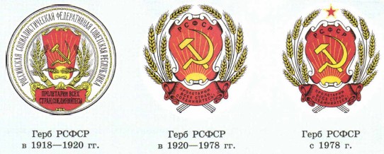 С 1918 по 1991 год, когда наше государство называлось Российская Советская Федеративная Социалистическая Республика (РСФСР), Государственный герб был совсем другим, а точнее, их было три: