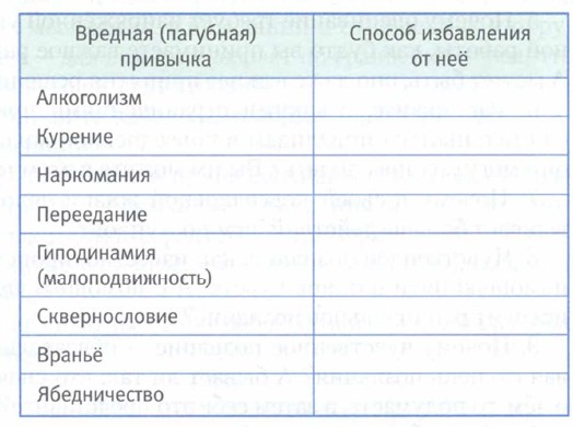 4. Какие свои привычки вы могли бы назвать вредными? 5. Как влияют на окружающих пагубные привычки человека? Практикум 1. Продолжите перечень полезных привычек: завтракать по утрам, чистить зубы утром и вечером... 2. Опишите способы, как избавиться от вредных привычек.