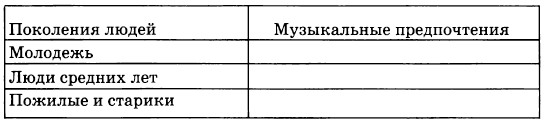 2. У каждого поколения (возрастной группы) свои предпочтения, привычки и вкусы, в том числе музыкальные. Старики любят и с удовольствием исполняют народные песни и песни советских композиторов. У людей среднего возраста и молодежи свои музыкальные пристрастия. В таблицу внесите музыкальные предпочтения людей разного возраста. Опишите их вкусы, характер и содержание исполняемых и любимых песен.