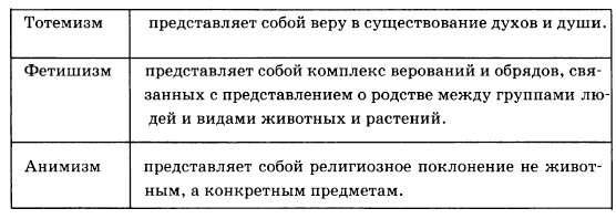 Проблема. Из истории известно, что в моменты кризисного состояния общества растет влияние религии на общественную и личную жизнь людей, расширяется спектр их религиозных и нерелигиозных верований, наблюдается всплеск всякого рода суеверий, оккультизма, мистики. Объясните, почему это происходит. Практикум. Ниже приведена обобщающая таблица, где отражены основные формы архаичных верований и даны их определения. Однако кто-то умудрился все перепутать. Помогите восстановить порядок.