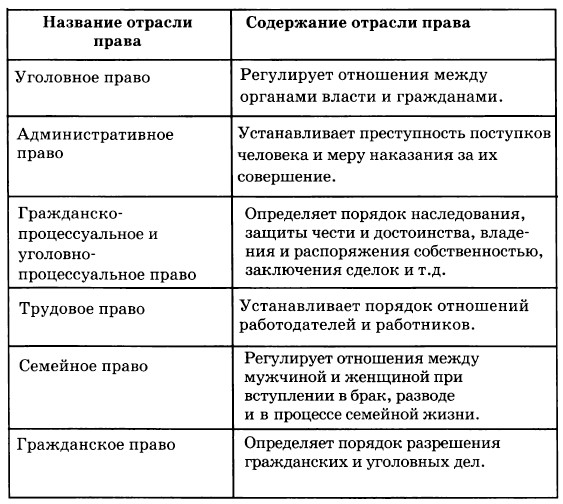 Проблема. Могут ли в государстве существовать права без обязанностей? Практикум. 1. Поспорили два юриста. Один из них сказал, что право означает то, что «всегда является справедливым и добрым», — таково естественное право человека. Другой возразил, отметив, что право означает то, что «полезно всем или многим в каком-либо государстве», — таково право гражданина. Помогите им разрешить спор. 2. Сопоставьте между собой содержание двух колонок таблицы, описывающей отрасли права.