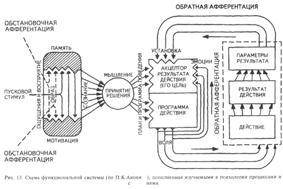 Глава 2. Естественнонаучные основы психологии Психика и мозг человека: принципы и общие механизмы связи (окончание)П. К. Анохин предложил модель организации и регуляции поведенческого акта, в которой есть место для всех основных психических процессов и состояний. Она получила название модели функциональной системы. Ее общее строение показано на рис. 13. Слева на этой схеме под названием «обстановочная афферентация» представлена совокупность разнообразных воздействий, которым подвергается человек, оказавшийся в той или иной ситуации. Многие связанные с ней стимулы могут оказаться несущественными, и только некоторые из них, вероятно, вызовут интерес — ориентировочную реакцию. Эти факторы на схеме изображены под названием «пусковой стимул». Прежде чем вызвать поведенческую активность, обстановочная афферентация и пусковой стимул должны быть восприняты, т.е. субъективно отражены человеком в виде ощущений и восприятий, взаимодействие которых с прошлым опытом (памятью) порождает образ. Сформировавшись, образ сам по себе поведения не вызывает. Он обязательно должен быть соотнесен с мотивацией и той информацией, которая хранится в памяти.
