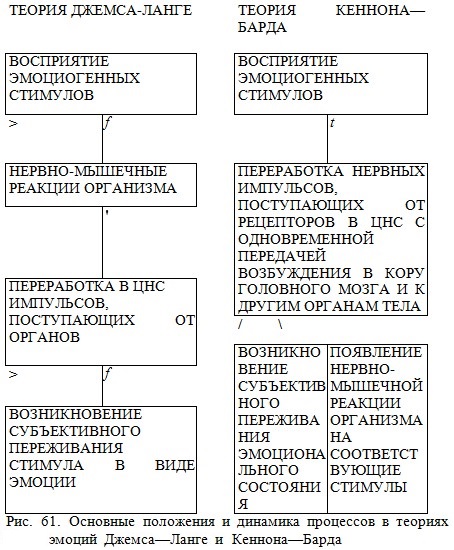 Глава 18. Эмоции Психологические теории эмоцийЗаметим сразу, что название этого параграфа не вполне точно отражает его содержание. Чисто психологических теорий эмоций, не затрагивающих физиологические и другие связанные с ними вопросы, на самом деле не существует, а идеи, взятые из разных областей научных исследований, в теориях эмоций обычно сосуществуют. Это не случайно, так как эмоцию как психологическое явление трудно отделить от процессов, происходящих в организме, и нередко психологические и физиологические характеристики эмоциональных состояний не просто сопровождают друг друга, но служат друг для друга объяснением. Кроме того, ряд теоретических вопросов, например вопрос о классификации и основных параметрах эмоциональных состояний, не может быть решен без обращения к физиологическим коррелятам эмоций. Многочисленными физиологическими изменениями в организме сопровождается всякое эмоциональное состояние. На протяжении истории развития данной области психологических знаний не раз предпринимались попытки связать физиологические изменения в организме с теми или иными эмоциями и показать, что комплексы органических признаков, сопровождающие различные эмоциональные процессы, действительно различны. В 1872 г. Ч. Дарвин опубликовал книгу «Выражение эмоций у человека и животных», которая явилась поворотным пунктом в понимании связи биологических и психологических явлений, в частности, организма и эмоций. В ней было доказано, что эволюционный принцип применим не только к биофизическому, но и психолого-поведенческому развитию живого, что между поведением животного и человека непроходимой пропасти не существует. Дарвин показал, что во внешнем выражении разных эмоциональных состояний, в экспрессивно-телесных движениях много общего у антропоидов и слепорожденных детей. Эти наблюдения легли в основу теории эмоций, которая получила название эволюционной. Эмоции согласно этой теории появились в процессе эволюции живых существ как жизненно важные приспособительные механизмы, способствующие адаптации организма к условиям и ситуациям его жизни. Телесные изменения, сопровождающие различные эмоциональные состояния, в частности, связанные с соответствующими эмоциями движения, по Дарвину, есть не что иное, как рудименты реальных приспособительных реакций организма. Идеи Ч. Дарвина были восприняты и развиты в другой теории, получившей в психологии широкую известность. Ее авторами явились У. Джемс и К. Ланге. Джемс считал, что определенные физические состояния характерны для разных эмоций — любопытства, восторга, страха, гнева и волнения. Соответствующие телесные изменения были названы органическими проявлениями эмоций. Именно органические изменения по теории Джемса—Ланге являются первопричинами эмоций. Отражаясь в голове человека через систему обратных связей, они порождают эмоциональное переживание соответствующей модальности. Сначала под действием внешних стимулов происходят характерные для эмоций изменения в организме и только затем — как их следствие — возникает сама эмоция. Альтернативную точку зрения на соотношение органических и эмоциональных процессов предложил У. Кеннон. Он одним из первых отметил тот факт, что телесные изменения, наблюдаемые при возникновении разных эмоциональных состоя