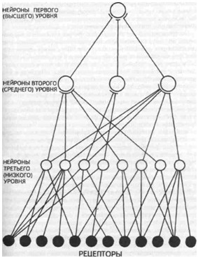 Рис. 21. Схема рецептивных полей разного уровня На приведенной схеме показано, что рецептивные поля различны по тому, какое количество рецепторов или нейронов из нижележащих уровней они включают. По современным данным формирование образа обеспечивается слаженной работой множества рецептивных полей, которые в свою очередь объединены в так называемые клеточные ансамбли. «Наименьшими единицами восприятия должны быть результаты возбуждения клеточных ансамблей, а не специфических рецепторных нейронов»1. Каждый такой клеточный ансамбль включает множество взаимосвязанных рецептивных полей разного уровня и должен соответствовать простому элементу сенсорного образа: углу или наклону линии в зрении, фонеме или различимому звуку в речи, определенной форме давления в осязании. Уже найдены нейроны, которые приходят в состояние возбуждения при стимулировании всего поля сетчаточных рецепторов определенной конфигурацией, например линией или краем специфической ориентации и наклона. Они не возбуждаются, если стимулируется не весь «клеточный ансамбль», а отдельные палочки и колбочки отдельными световыми точками в той же области сетчатки. Эти клетки, чувствительные к краям и линиям, расположены в сенсорной проекционной зоне зрения. 1 Хохберг Дж. Единицы мозговой активности, клеточные ансамбли и рецептивные поля // Хрестоматия по ощущению и восприятию. — М., 1975.