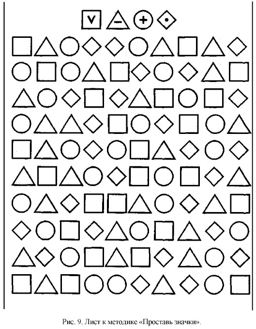 Методы психодиагностики детей дошкольного возраста Методы диагностики внимания. Психодиагностика. НемовМетодика 6. «Проставь значки»Тестовое задание в этой методике предназначено для оценки переключения и распределения внимания ребенка. Перед началом выполнения задания ребенку показывают рис. 9 и объясняют, как с ним работать. Эта работа заключается в том, чтобы в каждом из квадратиков, треугольников, кружков и ромбиков проставить тот знак, который задан вверху на образце, т.е., соответственно, галочку, черту, плюс или точку. Ребенок непрерывно работает, выполняя это задание в течение двух минут, а общий показатель переключения и распределения его внимания определяется по формуле:
