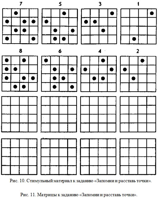 Методы психодиагностики детей дошкольного возраста Методы диагностики внимания (окончание)Методика 7. «Запомни и расставь точки»С помощью данной методики оценивается объем внимания ребенка. Для этого используется стимульный материал, изображенный на рис. 10. Лист с точками предварительно разрезается на 8 малых квадратов, которые затем складываются в стопку таким образом, чтобы вверху оказался квадрат с двумя точками, а внизу — квадрат с девятью точками (все остальные идут сверху вниз по порядку с последовательно увеличивающимся на них числом точек). Перед началом эксперимента ребенок получает следующую инструкцию: «Сейчас мы поиграем с тобой в игру на внимание. Я буду тебе одну за другой показывать карточки, на которых нарисованы точки, а потом ты сам будешь рисовать эти точки в пустых клеточках в тех местах, где ты видел эти точки на карточках». Далее ребенку последовательно, на 1-2 сек, показывается каждая из восьми карточек с точками сверху вниз в стопке по очереди и после каждой очередной карточки предлагается воспроизвести увиденные точки в пустой карточке (рис. 11) за 15 сек. Это время дается ребенку для того, чтобы он смог вспомнить, где находились увиденные точки, и отметить их в пустой карточке. Оценка результатов