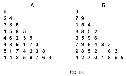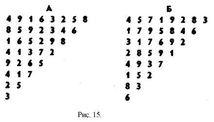 Если ошибка допущена, то экспериментатор повторяет соседний ряд цифр, находящийся справа (рис. 14 Б) и состоящий из такого же количества цифр, как и тот, в котором была допущена ошибка, и просит ребенка его воспроизвести. Если ребенок дважды ошибается в воспроизведении ряда цифр одной и той же длины, то на этом данная часть психодиагностического эксперимента завершается, отмечается длина предыдущего ряда, хотя бы раз полностью и безошибочно воспроизведенного, и переходят к зачитыванию рядов цифр, следующих в противоположном порядке — убывающем (рис. 15 А, Б).
