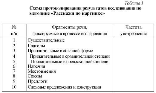 После того, как рассмотрение картинки закончено, ребенку предлагают рассказать о том, что он видел на ней. На рассказ по каждой картинке отводится еще по 2 мин. Психолог, проводящий исследование при помощи данной методики, фиксирует результаты в таблице (табл. 1), где отмечает наличие и частоту употребления ребенком различных частей речи, грамматических форм и конструкций.