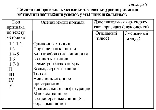 Методы психодиагностики младших школьников Методы изучения личности и межличностных отношений у младших школьниковСпециальных методов изучения личности и межличностных отношений младших школьников, как и дошкольников, не так уж много, во всяком случае гораздо меньше, чем аналогичных психодиагностических методов для взрослых, подростков и юношей. Однако потребность в точной личностной и коммуникативной диагностике детей этого возраста не меньше, чем в диагностике более старших детей, а если речь идет о сфере образования — то даже больше, так как становление личности и межличностных отношений — это одна из задач образования. При проведении личностной и межличностной психодиагностики детей младшего школьного возраста возникают проблемы, близкие к тем, которые мы уже обсуждали в соответствующем разделе предыдущей главы. Младшие школьники, особенно учащиеся первых двух классов, по своей психологии и поведению еще очень похожи на старших дошкольников. Тем не менее психологи располагают определенной совокупностью достаточно валидных и надежных методик психодиагностики личности и межличностных отношений в младшем школьном возрасте. Многие из этих методик представляют собой адаптированные применительно к детям данного возраста тесты для взрослых, другие созданы и применяются только по отношению к детям младшего школьного возраста. Одним из специальных детских тестов личностного плана является, например, уже описанный нами в предыдущей главе тест для психодиагностики мотивации достижения успехов. Он применим и для младших школьников, хотя в двух старших классах начальной школы вполне можно использовать проективный тест изменения этой же потребности, предназначенный для взрослых и основанный на Тематическом Апперцептивном Тесте Г. Маррея. Методика 24. Изучение мотивации достижения успеховПолное описание данной методики содержится в третьем разделе седьмой главы книги. Добавим к этому некоторые рекомендации, касающиеся сбора и систематизации экспериментальных данных. Для облегчения проведения анализа графических изображений рекомендуется воспользоваться следующей таблицей, где представлены признаки, выделяемые в ходе анализа, и оценки этих признаков в баллах (табл. 8). В эту таблицу-протокол в соответствующую графу и строку вносятся все отмечаемые в рисунке ребенка детали. По окончании анализа подсчитывается количество плюсов и минусов и производится их алгебраическая суммация. В результате получают количественный показатель степени развитости у детей мотивации достижения успехов (если сумма оказалась положительной) или мотивации избегания неудач (если сумма оказалась отрицательной).
