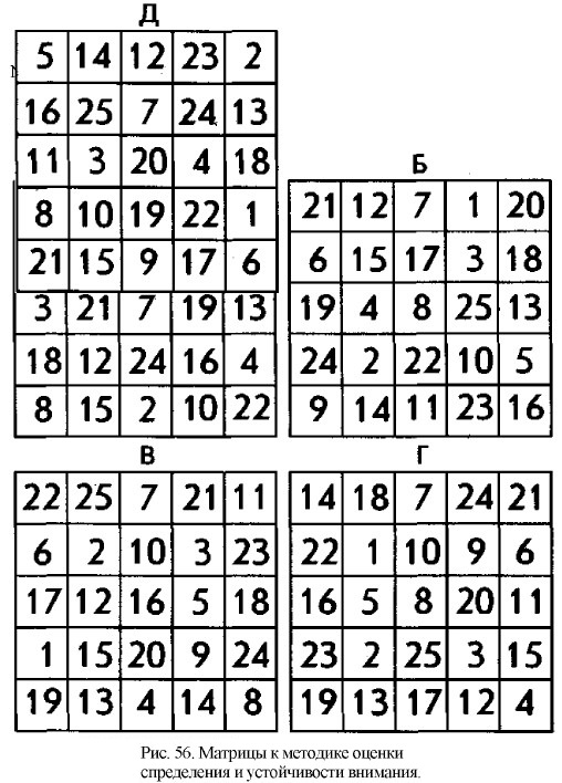 Методы психодиагностики подростков и юношей Методы психодиагностики познавательных процессов в подростковом и юношеском возрастеДля оценки внимания, памяти, воображения и речи подростков и юношей рекомендуется в основном использовать те же методы, с помощью которых диагностировались аналогичные процессы у младших школьников (см. комплекс методик, предназначенных для этой цели и подробно описанных в предыдущей главе книги). Исключение составляют только дополнительные методики, относящиеся, например, к сфере внимания (о них будет сказано дальше). Что же касается мышления, то здесь необходимо пользоваться тестами для взрослых, поэтому данный комплекс методик представляется и описывается в тексте достаточно подробно. Вновь представляемые методики частично касаются и психодиагностики речи, функционирующей в рамках словеснологического мышления. Более глубокую и разностороннюю диагностику уровня речевого развития подростков и юношей следует проводить с помощью лингвистических тестов совместно с учителями языка и литературы, применяя в том числе традиционные способы оценки, которые давно используются этими специалистами. Методика оценки распределения и устойчивости внимания с помощью 25-значных одноцветных цифровых таблицЭта методика предлагается в качестве дополнения к описанным ранее методикам, основанным на использовании колец Ландольта. Она позволяет оперативно и достаточно быстро в условиях, обеспечивающих повышенный интерес учащихся к содержанию выполняемых заданий, оценивать такие показатели внимания, как его распределение и устойчивость одновременно. Последнее обстоятельство немаловажно в том случае, если проводится психодиагностика подростков, которые чрезвычайно подвижны и, как правило, не в состоянии длительное время без отвлечения внимания выполнять относительно мало интересные тестовые задания. Следует, правда, иметь в виду, что показатели, получаемью при помощи данной методики, как правило, менее точны, чем показатели, которые можно получить, работая с кольцами Ландольта. Стимульным материалом к данной методике служат 5 чернобелых 25-значных таблиц, представленных на рис. 56 А, Б, В, Г, Д. В клетках этих таблиц в случайном порядке размещены цифры, от 1 до 25.