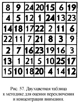 Для выполнения этой методики необходимо воспользоваться двухцветной, например черно-красной, таблицей, включающей в себя 49 цифр, из которых 25 одного цвета (к примеру красные) и 24 — другого цвета (например, черные). На таблице красные цифры выделены, они более темные. Испытуемый получает инструкцию как можно быстрее находить и указывать в таблице (рис. 57) поочередно то красные, то черные цифры, причем одни из них необходимо считать в прямом, а другие в обратном порядке. Например, можно предложить считать черные цифры от 1 до 24, а красные — от 25 до 1, чередуя их. Сначала находится и указывается в таблице черная цифра, затем — красная, после этого снова черная, красная и так далее до тех пор, пока не будут найдены и указаны все 49 имеющихся в таблице цифр. Определяется, сколько времени потребуется для того, чтобы безошибочно, не сбиваясь, выполнить все задание с начала и до конца. Если испытуемый ошибается в ходе счета хотя бы один раз, то задание считается невыполненным, и испытуемому предоставляется возможность начать его сначала. Эксперимент продолжается до тех пор, пока хотя бы раз испытуемый не справится с заданием безошибочно. Величина, обратная числу попыток выполнения задания, является показателем концентрации внимания, а время, затраченное на последнее, безошибочное его выполнение — показателем переключения внимания.