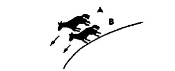52. Какая из лошадок должна бежать на повороте быстрее для того, чтобы ее не обогнала другая? 1. Лошадка А. 2. Обе должны бежать с одинаковой скоростью. 3. Лошадка В.