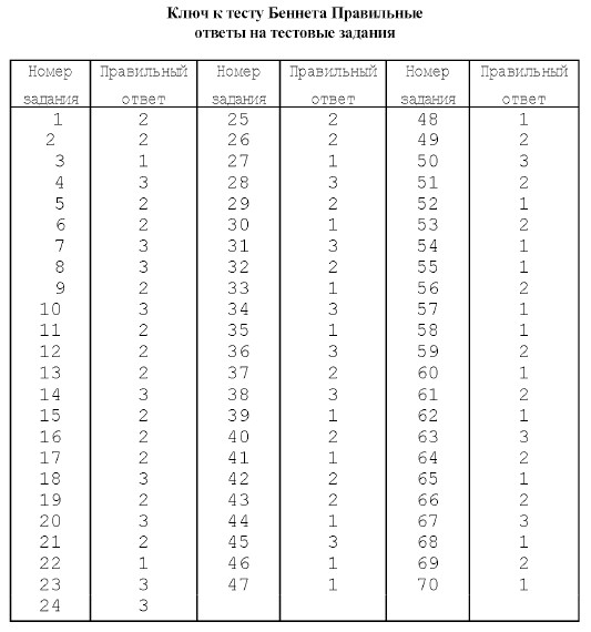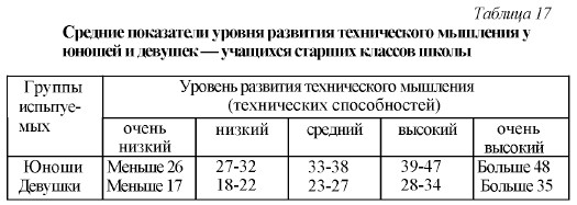Методы психодиагностики подростков и юношей Методы оценки мышления у подростков и старших школьников (окончание)Методика 15. Тест Беннета. Оценка уровня развития технического мышленияДанный тест предназначен для того, чтобы оценивать техническое мышление человека, в частности — его умение читать чертежи, разбираться в схемах технических устройств и их работе, решать простейшие физико-технические задачи. В данном тесте испытуемый получает 70 технических рисунков с заданиями и вариантами возможных ответов на них. Задача испытуемого состоит в том, чтобы к каждому из рисунков найти правильное решение изображенной на нем задачи. На всю работу над тестом отводится 25 мин. Развитость технического мышления оценивается по количеству правильно решенных за это время задач. Далее под номерами от 1 до 70 даны соответствующие задания в виде рисунков и связанных с ними вопросов. Под каждым из вопросов, в свою очередь, даны три варианта возможных ответов на него, причем только один из них является правильным. Испытуемому необходимо выбрать и указать правильный ответ, написав на отдельном листе бумаги номер задачи и номер избранного ответа на эту задачу. Запись 3.1 будет означать, что при решении 3-й задачи испытуемый счел правильным 1-й из предложенных ответов на нее. В следующих далее таблицах (табл. 16 и 17) содержатся, соответственно, ключевые ответы на задания теста Беннета и нормативные данные, пользуясь которыми, можно оценивать уровень развития технического мышления у подростков и старших школьников.