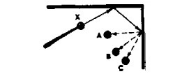 25. С каким шариком столкнется шарик X, если его ударить о преграду в направлении, указанном сплошной стрелкой? 1. С шариком А. 2. С шариком В. 3. С шариком С.