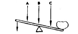 40. В каком месте переломится палка, если резко нажать на ее конец слева? 1. В месте А. 2. В месте В, 3. В месте С.