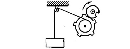 44. Как будет двигаться подвешенный груз, если верхнее колесо вращается в направлении стрелки? 1. Прерывисто вниз. 2. Прерывисто вверх. 3. Непрерывно вверх.