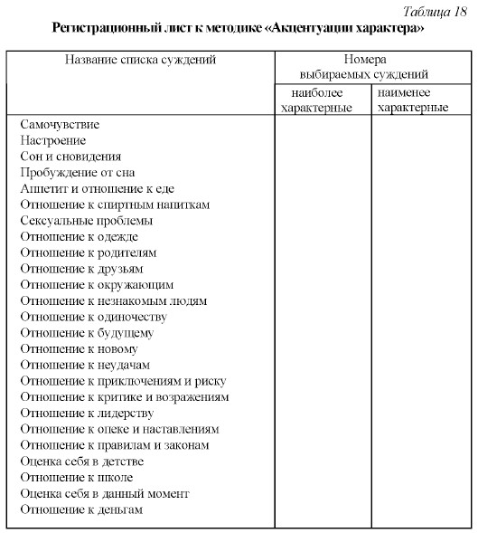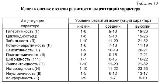 Процедура работы с методикой такова. Читая каждый из следующих списков суждений, испытуемый должен сначала выбрать три наиболее характерные для него и записать соответствующие номера во второй графе регистрационного листа, а затем то же самое сделать для наименее характерных для него, отметив соответствующие номера в третьей графе регистрационного листа. Если он не может выбрать ничего подходящего или же выбирает меньше трех суждений, то может ограничиться в своих выборах меньшим числом и, соответственно, вписывает во вторую и третью графы регистрационного листа меньшее количество цифр. При повторном чтении списка испытуемому предлагается выбрать не менее трех суждений, наименее характерных для него, и записать их номера в третью графу регистрационного листа. В приводимых далее списках суждений справа имеется их расшифровка, т.е. указано на то, к какому типу относится выбор данного суждения. Буквенные символы расшифровки соответствуют следующим типам: Г — гипертимный, Л — лабильный, Ц — циклоидный, А — астеноневротический, С — сенситивный, П — психастенический, Ш — шизоидный, Э — эпилептоидный, И — истероидный, Н — неустойчивый, К — конформный. Оценка результатов За каждый выбор, соответствующий указанному символу, испытуемый получает по одному баллу. Если символов несколько, то число баллов увеличивается по количеству символов. Например, за выбор с символом А испытуемый получает 1 балл, который приписывается развитости у него астеноневротического характера, а за выбор символов ГШК — три балла, причем в данном случае по данному баллу получают показатели развитости у него сразу трех типов акцентуаций характера: гипертимного, шизоидного и конформного. Выводы об уровне развития Доминирующий тип акцентуированного характера определяется по максимальному числу баллов, набранных испытуемым. Ниже приводится таблица 19, в соответствии с которой по количеству набранных баллов можно судить о степени развитости у испытуемого различных акцентуаций характера. Слева в этой таблице перечислены оцениваемые акцентуации, а справа указано количество баллов, соответствующее трем уровням развитости этих акцентуаций: низкому, среднему и высокому. Например, если по гипертимности (Г) испытуемый набрал 17 баллов, то по уровню развития у него соответствующей акцентуации характера он считается находящимся на среднем уровне; если по конформности (К) у него оказалось 10 баллов, то делается вывод о том, что он находится на высоком уровне развития.