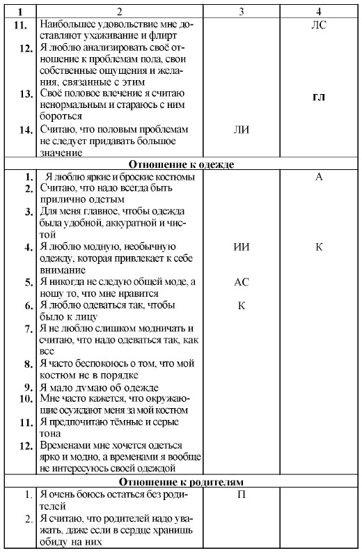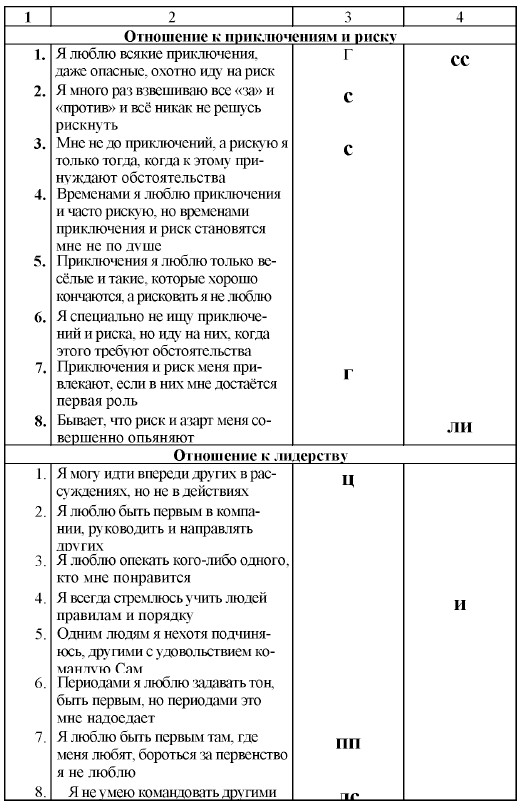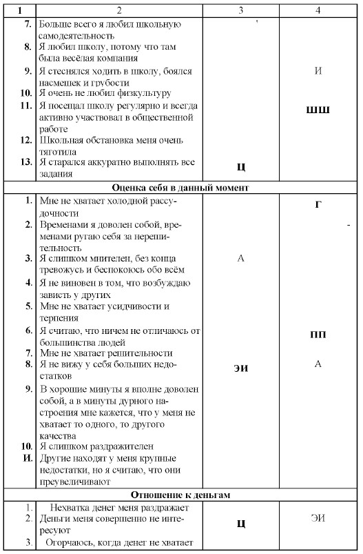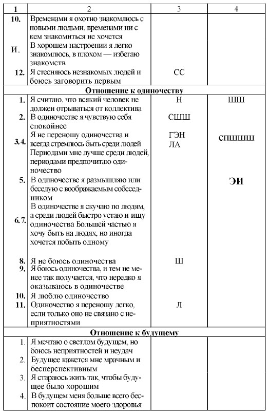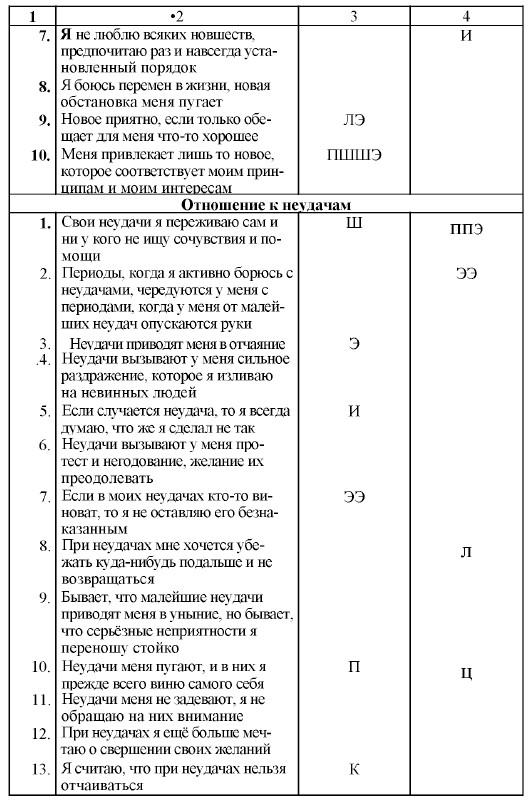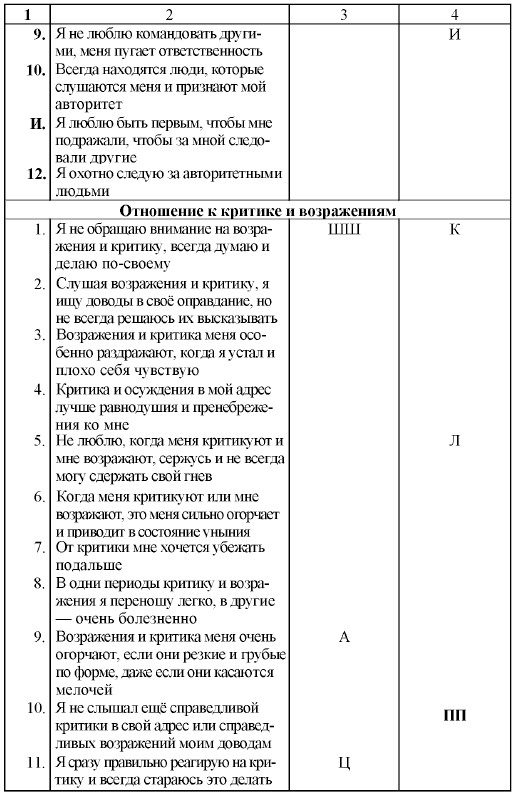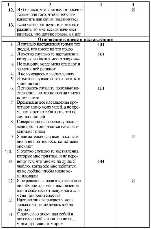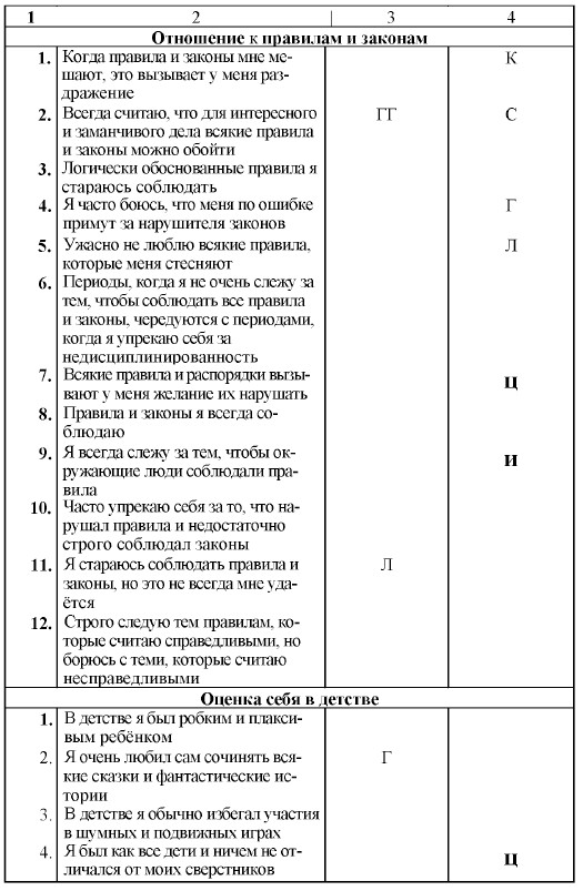 З а м е ч а н и е. В приведенных списках суждений имеется много таких, которые не зашифрованы. Часть подобных суждений в оригинальном, авторском варианте методики Личко служит цели выявления не только акцентуаций, но и патологий характера. Использование описанной методики в этих целях требует специального образования, профессиональной компетенции и доступно только медицинским психологам, психотерапевтам и психиатрам. Поэтому данная часть методики из описания исключена. Тем не менее многими из незашифрованных суждений можно воспользоваться для того, чтобы провести дополнительный качественный анализ особенностей характера испытуемых. Для этого выбранные ими суждения, которые не имеют определенного шифра, необходимо соотнести с данными в начале описания методики краткими характеристиками различных типов акцентуированных характеров. Другая часть незашифрованных суждений не используется и в оригинальном варианте методики. Они служат для того, чтобы испытуемый мог свободно, без внутреннего напряжения отвечать на все суждения, так как та часть незашифрованных суждений, о которой здесь идет речь, является эмоционально и информационно нейтральной, т.е. ответы на них не свидетельствуют о наличии у испытуемых каких-либо акцентуаций в характере.