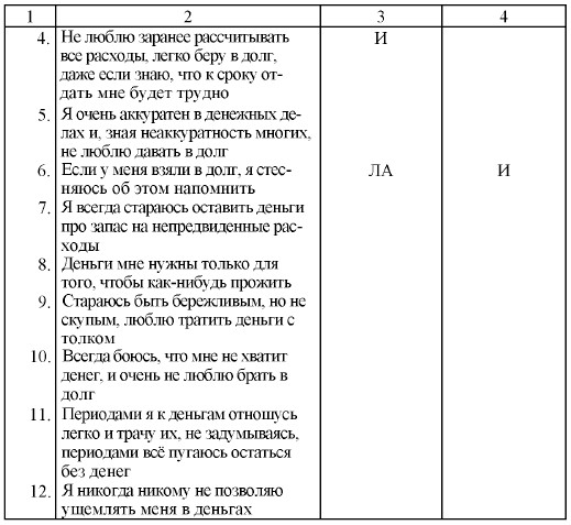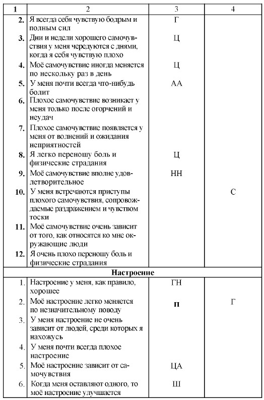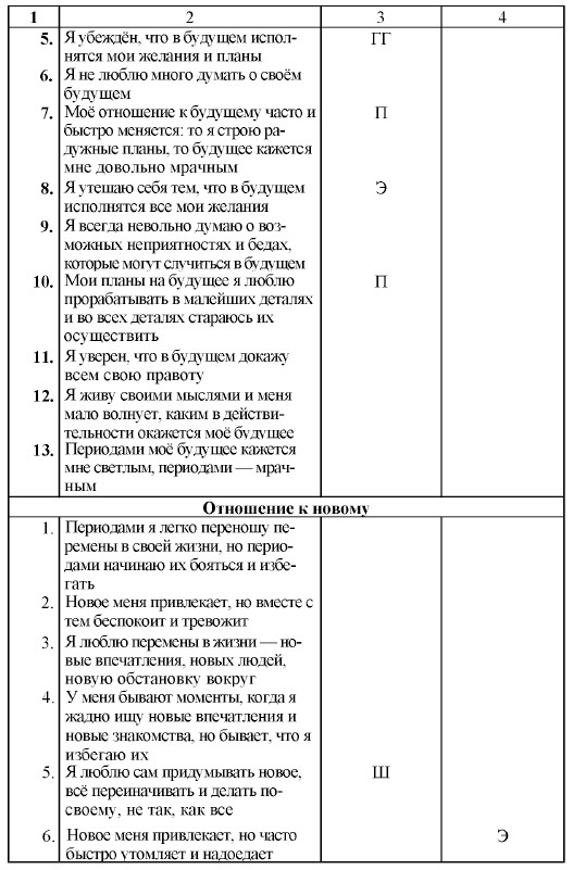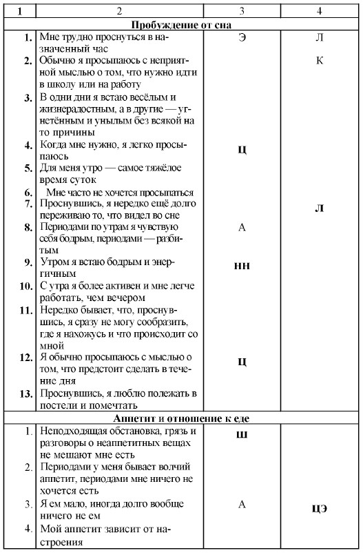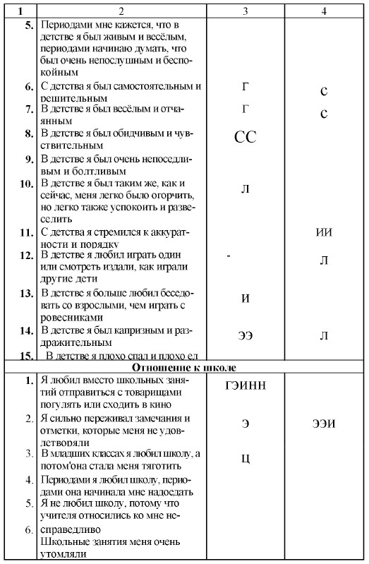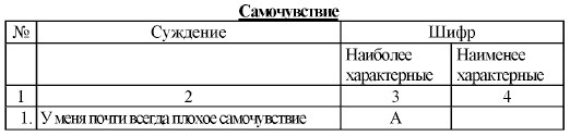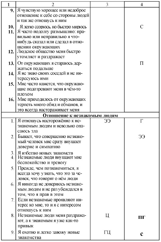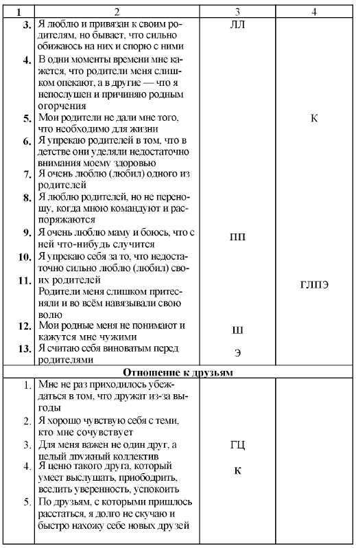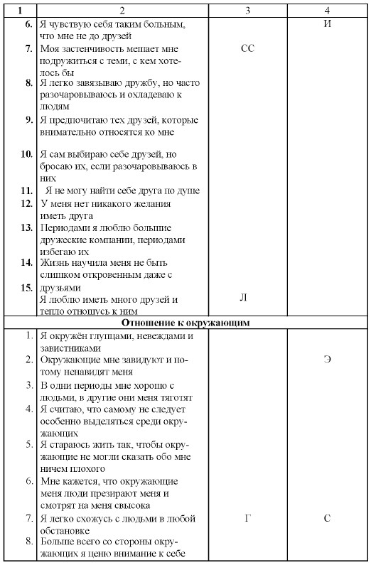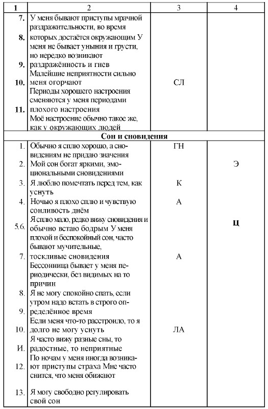 З а м е ч а н и е. В приведенных списках суждений имеется много таких, которые не зашифрованы. Часть подобных суждений в оригинальном, авторском варианте методики Личко служит цели выявления не только акцентуаций, но и патологий характера. Использование описанной методики в этих целях требует специального образования, профессиональной компетенции и доступно только медицинским психологам, психотерапевтам и психиатрам. Поэтому данная часть методики из описания исключена. Тем не менее многими из незашифрованных суждений можно воспользоваться для того, чтобы провести дополнительный качественный анализ особенностей характера испытуемых. Для этого выбранные ими суждения, которые не имеют определенного шифра, необходимо соотнести с данными в начале описания методики краткими характеристиками различных типов акцентуированных характеров. Другая часть незашифрованных суждений не используется и в оригинальном варианте методики. Они служат для того, чтобы испытуемый мог свободно, без внутреннего напряжения отвечать на все суждения, так как та часть незашифрованных суждений, о которой здесь идет речь, является эмоционально и информационно нейтральной, т.е. ответы на них не свидетельствуют о наличии у испытуемых каких-либо акцентуаций в характере.