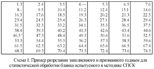 З а м е ч а н и е. Если по тому или иному суждению испытуемый не в состоянии оценить свою группу, то в бланк вместо конкретной цифровой оценки вносится прочерк «-», соответствующий последнему пункту словесной оценочной шкалы «затрудняюсь сказать». Необходимо, однако, стараться, чтобы этих прочерков было как можно меньше. После того как все бланки заполнены членами группы, производятся анализ и оценка результатов исследования. Анализ и оценка результатов исследования В первую очередь при анализе результатов исследования решается вопрос о доверии ответам испытуемых. Решение о доверии принимается на следующих двух основаниях: 1. Если ответы испытуемых на все контрольные вопросы, по ставленные в бланке под номерами 15, 30, 45, 60 и 75 оказались стандартными, т.е. равными 0 баллов. В самом деле, именно та кую оценку по всем этим вопросам должен проставить внима тельный и добросовестно выполняющий свое дело испытуемый, так как на самом деле нет ни одного человека, кто бы «никогда и ни в чем не ошибался» (15-й вопрос), «никогда и ни в чем не со мневался» (30-й вопрос), «всегда и во всем был прав» (45-й воп рос), «умел делать все на свете» (60-й вопрос) и «на любой воп рос мог дать правильный ответ» (75-й вопрос). Часто встречается такая ситуация, когда в одном и том же бланке имеются правильные и неправильные ответы на контрольные вопросы. Тогда принимается компромиссное решение: часть бланка, где встретились ошибочные ответы, бракуется, а та часть, где ответы на контрольные вопросы оказались соответствующими эталону, сохраняется и используется в процессе дальнейших подсчетов. Если, к примеру, неверный ответ на контрольный вопрос встретился во второй строке бланка, то она и предыдущая строка, в конце которой не было контрольных вопросов, просто аккуратно вычеркиваются из соответствующего бланка. 2. Если среди различных оценок, имеющихся в бланке дан ного испытуемого, встречается не менее трех разных, например: 1, 3 и 5 или 2, 4 и 5. Заметим, что наличие не менее трех разных оценок в бланке ответов испытуемого означает, что он достаточ но хорошо различает уровень развития в группе разных межлич ностных отношений. Дальнейшей статистической обработке, преследующей цель получения оценок, характеризующих уровень развития в группе разных межличностных отношений, подлежат только те бланки испытуемых или их части, которые выдержали проверку по пункту 1 и пункту 2. Все оказавшиеся годными для статистической обработки бланки сначала разрезаются на вертикальные полосы так, как это показано на схеме 1, которая представляет собой образец уже заполненного испытуемым и оказавшегося годным для обработки бланка. Линии вертикального разреза показаны на нем столбцами точек. Эти столбцы как бы отделяют друг от друга столбцы порядковых номеров суждений, относящихся к отдельным подшкалам методики, вместе с оценками испытуемого по этим суждениям2. 2 Предварительно от бланка испытуемого отрезается и отбрасывается крайний правый столбец с оценками по контрольным суждениям и оценочная шкала (верхняя часть бланка)