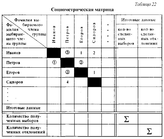 Оценка результатов Оценки, данные по каждой шкале (паре противоположных эмоционально-оценочных прилагательных), переводятся в баллы в соответствии со шкалой, представленной в верхней части рисунка. Если отметка испытуемого располагается между двумя пунктами шкалы, то берется промежуточное, дробное число баллов. Далее вычисляется средняя оценка по всем десяти шкалам семантического дифференциала. Она и является количественной характеристикой общего эмоционального отношения испытуемого к тому человеку, к которому относятся полученные оценки. Отношение считается положительным, если средняя оценка также положительная; отношение рассматривается как отрицательное, если соответствующая средняя оценка отрицательная. Сила эмоционального отношения, соответственно, отражается в абсолютной величине полученной средней оценки. Методика 23. Социометрическая методикаЭта методика позволяет определить положение испытуемого в системе межличностных отношений той группы, к которой он принадлежит. Исследование группы при помощи данной методики обычно проводится тогда, когда группа включает в себя не менее 10 человек и существует не менее одного года. Перед началом исследования члены группы, собравшиеся в каком-либо помещении, например, в классе или в аудитории, получают инструкцию примерно следующего содержания: «Ваша группа (класс) существует уже давно. За время совместной жизни и общения друг с другом вы, наверное, смогли неплохо узнать друг друга, и между вами сложились определенные личные и деловые отношения, симпатии и антипатии, уважение, неуважение друг к другу и т.п. Не все, очевидно, складывалось гладко и образовавшиеся между вами отношения далеки, по-видимому, от идеала. С кем-то вам хорошо находиться в одной группе (классе), кто-то вас не очень устраивает и с ним вы хотели бы расстаться. Теперь представьте себе, что ваша группа начинает складываться сначала и каждому из вас представляется возможность вновь по своему желанию определить состав группы (класса). Ответьте в этой связи на следующие вопросы, записав свои ответы на отдельном листе бумаги. Его предварительно необходимо подписать, чтобы мы могли судить о том, кто и кого выбирает или отвергает. 1. Кого из членов вашей группы (класса) вы по своему желанию включили бы в состав новой группы (класса)? Запишите этих людей на листе бумаги под номером 1 в порядке предпочтения. 2. Кого из членов вашей группы вы, напротив, не хотели бы видеть в составе новой группы (класса)? Запишите их под номером 2 в порядке отклонения». Листы с ответами испытуемых на предложенные вопросы обрабатываются, и имеющаяся в них информация переносится в специальную таблицу (табл. 22), называемую социометрической матрицей.