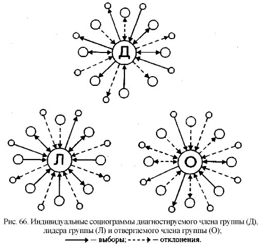 В центре индивидуальной социограммы (рис. 66) располагается тот член группы, чьи отношения данная индивидуальная социограмма представляет, а вокруг него кружками обозначаются остальные участники группы, с которыми у данного человека установились определенные отношении (те, кого он выбрал или отклонил, и те, кто его самого выбрал или отклонил). Те члены группы, с которыми сложились более тесные положительные или отрицательные отношения, на индивидуальной социограмме располагаются ближе к центру, а те, с кем сложились менее тесные отношения, — дальше к периферии. Первые изображаются при помощи кружков большей, а вторые — меньшей величины.