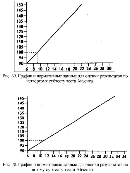 Во всех остальных случаях искомый показатель определяется следующим образом. Сначала определяется показатель по четвертому субтесту. Для этого на графике, представленном на рис. 69, по горизонтальной линии откладывается количество правильно решенных за отведенное время задач. Затем из полученной точки до пересечения с линией графика восстанавливается перпендикуляр, который затем из точки пересечения опускается на вертикальную ось графика. Точка пересечения опущенного перпендикуляра с вертикальной осью графика указывает на частный показатель уровня интеллектуального развития испытуемого по четвертому субтесту. Таким же способом получается аналогичный показатель для пятого субтеста, но в этом случае пользуются уже графиком, представленным на рис. 70. В заключение берут полусумму показателей по четвертому и пятому субтестам, и она, округленная до целого числа, и является итоговым показателем уровня общего интеллектуального развития данного испытуемого. Именно этот показатель записывается в соответствующую графу Индивидуальной карты психологического самоконтроля взрослого человека.