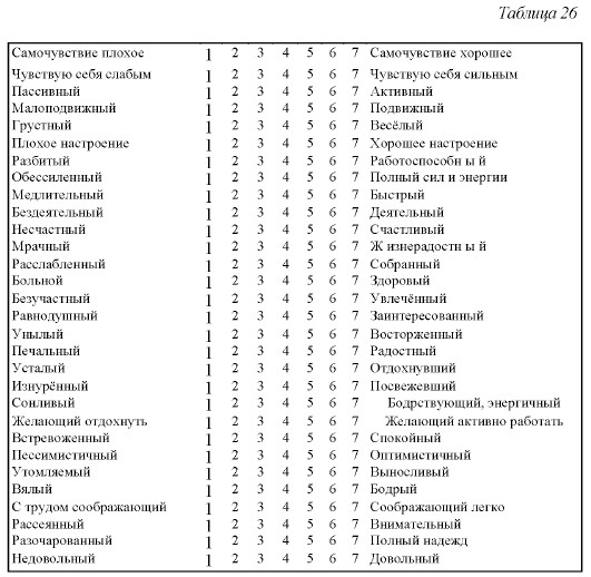 Методы психодиагностики студентов, учителей и родителей Методы изучения личности взрослого человекаМетодов изучения личности взрослого человека, которые можно было бы применить для психодиагностики студентов, учителей и родителей, довольно много. Для этой цели фактически могут пригодиться любые методики, предназначенные для взрослых людей, и большая часть известных в настоящее время психодиагностических методик как раз касается личности. Но среди множества имеющихся в нашем распоряжении методик все же есть такие, которые затрагивают черты личности человека, наиболее важные для успешного выполнения педагогической деятельности. Они включают в себя педагогически значимые свойства характера человека, его стремление к достижению успехов, способы решения жизненных проблем и объяснения поведения других людей. В этой связи в набор предлагаемых и подробно описываемых далее методик мы включили такие, которые позволяют оценивать следующие особенности психологии человека, представленные в соответствующих блоках диагностических методик. I блок. Состояния личности в данный момент времени: са мочувствие, одиночество, ощущение бессмысленности сущест вования, свобода выбора, половой конфликт, враждебный на строй по отношению к людям и миру, расхождение между ре альным и идеальным Я, свобода воли, безнадежность, чувство не прикаянности (бездомности). II блок. Черты характера: объективность, сила воли, неза висимость. III блок. Решение жизненных проблем: уровень субъективного контроля, выход из сложных жизненных ситуаций, чувство юмора. IV блок. Мотивы поведения: аффилиация, потребность в достижении успехов. Далее все частные методики, включенные в эти блоки и представленные через перечень личностных качеств, которые с помощью этих методик оцениваются, подробно описываются в указанной последовательности под теми порядковыми номерами, под которыми они отмечены в Индивидуальной карте педагогического самоконтроля взрослого человека. Методика 5. «Самочувствие — активность — настроение» (Предназначается для комплексной оценки преобладающего настроения человека)В этой методике испытуемому, как и в методике «Семантический дифференциал», предлагается много пар оценочных суждений с противоположными по смыслу прилагательными. С помощью этих суждений он должен оценить свое доминирующее самочувствие, активность и настроение. На каждую из этих характеристик доминирующего эмоционального состояния в методике приходится по 10 пар прилагательных, а всего их 30. Они представлены в таблице 26.