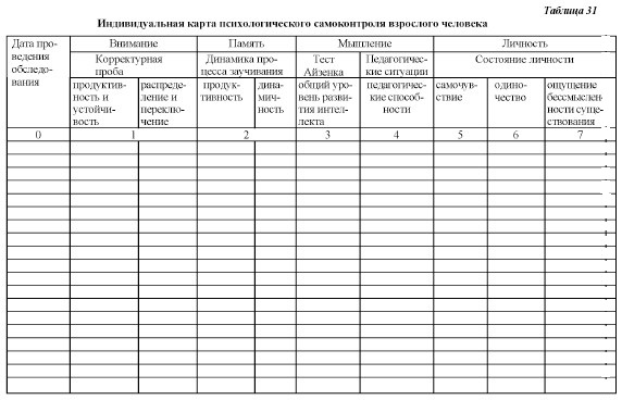 Методы психодиагностики студентов, учителей и родителей Контрольные вопросы, практические занятия и дополнительная литература к главеКонтрольные вопросы1. Специфика социально-психологических проблем, характерных для взрослых людей в отличие от детей. 2. Мотивационные и эмоциональные особенности взрослых людей. 3. Особенности психодиагностики познавательных процессов у взрослых людей. 4. Методы изучения внимания взрослых людей. 5. Оценка динамики процесса запоминания у взрослых людей. 6. Оценка педагогических способностей взрослых людей. 7. Что такое педагогическая психодиагностика? 8. Методы психодиагностики состояний личности взрослого человека и выводы о его готовности к педагогической деятельности. 9. Методы психодиагностики черт характера взрослых людей. 10. Определение способов решения взрослым человеком жизненных проблем с целью установления его готовности к педагогической работе. 11. Педагогически направленная оценка мотивов поведения взрослого человека. 12. Методы педагогического изучения межличностных установок и отношений взрослых людей. 13. Психодиагностика родительских установок. 14. Определение степени удовлетворенности браком. 15. Выяснение склонности и способности быть лидером. 16. Оценка эффективности стиля руководства людьми. Практические задания1. Произвести оценку собственных состояний личности: самочувствия, одиночества, смысла существования, свободы воли и выбора, конфликта в половой сфере, враждебности настроя, расхождения между реальным и идеальным Я, ощущения беспомощности и неприкаянности. Сделать из этого выводы о возможности занятий педагогической деятельностью. 2. Произвести психодиагностику следующих черт характера: оптимизма, объективности, силы воли и независимости. 3. Определить способы решения жизненных проблем, включая диагностику уровня субъективного контроля, способов выхода из затруднительных жизненных ситуаций, чувства юмора у двух-трех взрослых людей или студентов. 4. Оценить мотив аффилиации и мотивацию достижения успехов у двух-трех взрослых людей, включенных в педагогическую работу с детьми. 5. Провести психодиагностику родительских установок (отношений), степени удовлетворенности браком у двух-трех родителей благополучных и неблагополучных детей. Сделать педагогические выводы о правильности этих установок и о влиянии удовлетворенности браком на воспитание детей. 6. Выяснить склонность и способность быть эффективным лидером у двух-трех студентов педвуза.