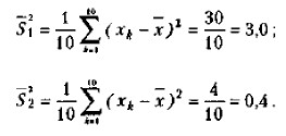 n — количество испытуемых в выборке или первичных значений, по которым вычисляется дисперсия. Определим дисперсии для двух приведенных выше выборок частных значений, обозначив эти дисперсии соответственно индексами 1 и 2:
