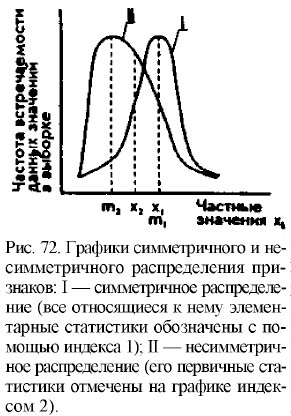 Медианой называется значение изучаемого признака, которое делит выборку, упорядоченную по величине данного признака, пополам. Справа и слева от медианы в упорядоченном ряду остается по одинаковому количеству признаков. Например, для выборки 2, 3, 4, 4, 5, 6, 8, 7, 9 медианой будет значение 5, так как слева и справа от него остается по четыре показателя. Если ряд включает в себя четное число признаков, то медианой будет среднее, взятое как полусумма величин двух центральных значений ряда. Для следующего ряда 0, 1,1, 2, 3, 4, 5, 5, 6, 7 медиана будет равна 3,5. Знание медианы полезно для того, чтобы установить, является ли распределение частных значений изученного признака симметричным и приближающимся к так называемому нормальному распределению. Средняя и медиана для нормального распределения обычно совпадают или очень мало отличаются друг от друга. Если выборочное распределение признаков нормально, то к нему можно применять методы вторичных статистических расчетов, основанные на нормальном распределении данных. В противном случае этого делать нельзя, так как в расчеты могут вкрасться серьезные ошибки. Если в книге по математической статистике, где Описывается тот или иной метод статистической обработки, имеются указания на то, что его можно применять только к нормальному или близкому к нему распределению признаков, то необходимо не укоснительно следовать этому правилу и полученное эмпирическое распределение признаков проверять на нормальность. Если такого указания нет, то статистика применима к любому распределению признаков. Приблизительно судить о том, является или не является полученное распределение близким к нормальному, можно, построив график распределения данных, похожий на те, которые представлены на рис. 72. Если график оказывается более или менее симметричным, значит, к анализу данных можно применять статистики, предназначенные для нормального распределения. Во всяком случае, допустимая ошибка в расчетах в данном случае будет относительно небольшой. Приблизительные картины симметричного и несимметричного распределений признаков показаны на рис. 72, где точками m1 и m2 на горизонтальной оси графика обозначены те величины признаков, которые соответствуют медианам, а х1 и x2 — те, которые соответствуют средним значениям.