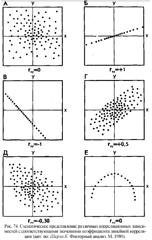 П р и м е ч а н и е. Таблица для граничных значений распределения приведена в сокращенном виде. Полностью ее можно найти в справочниках по математической статистике, в частности в тех, которые даны в списке дополнительной литературы к этой главе. П р и м е р. Сравним дисперсии следующих двух рядов цифр с целью определения статистически достоверных различий между ними. Первый ряд: 4,6, 5,7,3,4,5,6. Второй ряд: 2,7, 3,6,1,8, 4, 5. Средние значения для двух этих рядов соответственно равны: 5,0 и 4,5. Их дисперсии составляют: 1,5 и 5,25. Частное от деления большей дисперсии на меньшую равно 3,5. Это и есть искомый показатель F. Сравнивая его с табличным граничным значением 3,44, приходим к выводу о том, что дисперсии двух сопоставляемых выборок действительно отличаются друг от друга на уровне значимости более 95% или с вероятностью допустимой ошибки не более 0,05%. Следующий метод вторичной статистической обработки, посредством которого выясняется связь или прямая зависимость между двумя рядами экспериментальных данных, носит название метод корреляций. Он показывает, каким образом одно явление влияет на другое или связано с ним в своей динамике. Подобного рода зависимости существуют, к примеру, между величинами, находящимися в причинно-следственных связях друг с другом. Если выясняется, что два явления статистически достоверно коррелируют друг с другом и если при этом есть уверенность в том, что одно из них может выступать в качестве причины другого явления, то отсюда определенно следует вывод о наличии между ними причинно-следственной зависимости. Имеется несколько разновидностей данного метода: линейный, ранговый, парный и множественный. Линейный корреляционный анализ позволяет устанавливать прямые связи между переменными величинами по их абсолютным значениям. Эти связи графически выражаются прямой линией, отсюда название «линейный». Ранговая корреляция определяет зависимость не между абсолютными значениями переменных, а между порядковыми местами, или рангами, занимаемыми ими в упорядоченном по величине ряду. Парный корреляционный анализ включает изучение корреляционных зависимостей только между парами переменных, а множественный, или многомерный, — между многими переменными одновременно. Распространенной в прикладной статистике формой многомерного корреляционного анализа является факторный анализ. На рис. 74 в виде множества точек представлены различные виды зависимостей между двумя переменными X и Y (различные поля корреляций между ними). На фрагменте рис. 74, отмеченном буквой А, точки случайным образом разбросаны по координатной плоскости. Здесь по величине X нельзя делать какие-либо определенные выводы о величине У. Если в данном случае подсчитать коэффициент корреляции, то он будет равен 0, что свидетельствует о том, что достоверная связь между X и У отсутствует (она может отсутствовать и тогда, когда коэффициент корреляции не равен 0, но близок к нему по величине). На фрагменте Б рисунка все точки лежат на одной прямой, и каждому отдельному значению переменной X можно поставить в соответствие одно и только одно значение переменной У, причем, чем большее, тем больше Y. Такая связь между переменными X и У называется прямой, и если это прямая, соответствующая уравнению регрессии, то связанный с ней коэффициент корреляции будет равен +1. (Заметим, 