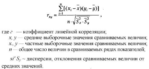 Наконец, фрагмент Е дает коэффициент корреляции, равный или близкий к 0, так как в данном случае связь между переменными хотя и существует, но не является линейной. Коэффициент линейной корреляции определяется при помощи следующей формулы: