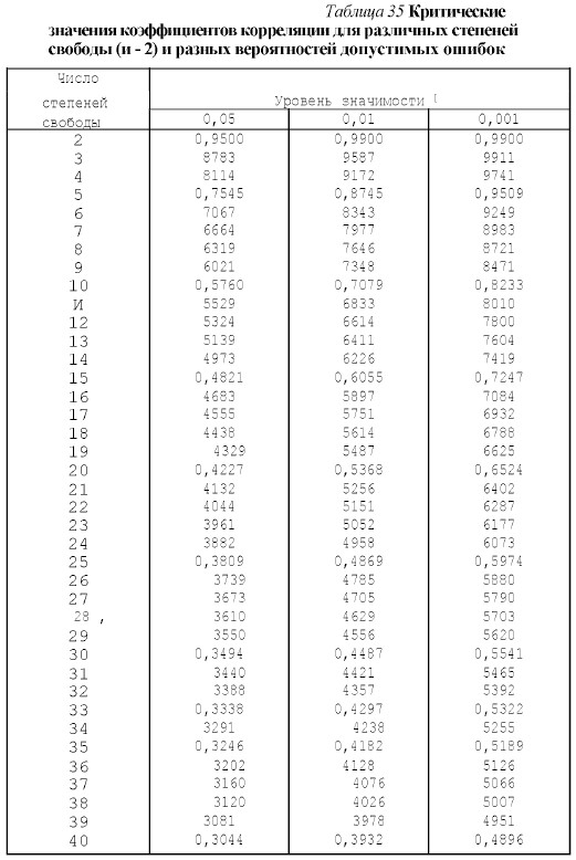 Определив сумму квадратов различий в рангах и подставив нужное значение в числитель формулы, получаем, что коэффициент ранговой корреляции равен 0,97, т.е. достаточно высок, что и говорит о том, что между интересом к учебному предмету и успеваемостью учащихся действительно существует статистически достоверная зависимость. Однако по абсолютным значениям коэффициентов корреляции не всегда можно делать однозначные выводы о том, являются ли они значимыми, т.е. достоверно свидетельствуют о существовании зависимости между сравниваемыми переменными. Может случиться так, что коэффициент корреляции, равный 0,50, не будет достоверным, а коэффициент корреляции, составивший 0,30, — достоверным. Многое в решении этого вопроса зависит от того, сколько показателей было в коррелируемых друг с другом рядах признаков: чем больше таких показателей, тем меньшим по величине может быть статистически достоверный коэффициент корреляции. В табл. 35 представлены критические значения коэффициентов корреляции для различных степеней свободы. (В данном случае степенью свободы будет число, равное n — 2, где n — количество данных в коррелируемых рядах.) Заметим, что значимость коэффициента корреляции зависит и от заданного уровня значимости или принятой вероятности допустимой ошибки в расчетах. Если, к примеру, коррелируется друг с другом два ряда цифр по 10 единиц в каждом и получен коэффициент корреляции между ними, равный 0,65, то он будет значимым на уровне 0,95 (он больше критического табличного значения, составляющего 0,6319 для вероятности допустимой ошибки 0,05, и меньше критического значения 0,7646 для вероятности допустимой ошибки 0,01).