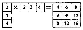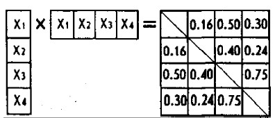 Анализ корреляционной матрицы показывает, что переменная 1 (характер) значимо коррелирует с переменными 2 и 3 (способности и потребности). Переменная 2 (способности) достоверно коррелирует с переменной 3 (потребности), а переменная 3 (потребности) — с переменной 4 (успеваемость). Фактически из шести имеющихся в матрице коэффициентов корреляции четыре являются достаточно высокими и, если предположить, что они определялись на совокупности испытуемых, превышающей 10 человек, — значимыми. Зададим некоторое правило умножения столбцов цифр на строки матрицы: каждая цифра столбца последовательно умножается на каждую цифру строки и результаты парных произведений записываются в строку аналогичной матрицы. Пример: если по этому правилу умножить друг на друга три цифры столбца и строки, представленные в левой части матричного равенства, то получим матрицу, находящуюся в правой части этого же равенства: