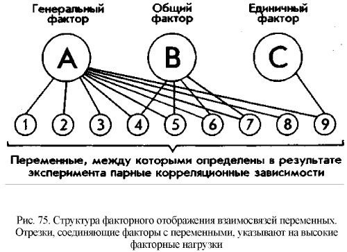 Здесь x1 х2 х3 и х4 — искомые числа. Для их точного и быстрого определения существуют специальные математические процедуры и программы для ЭВМ. Допустим, что мы уже нашли эти цифры: х1 = 0,45, х2 = 0,36 х3 = 1,12, х4 = 0,67. Совокупность найденных цифр и называется фактором, а сами эти цифры — факторными весами или нагрузками. Эти цифры соответствуют тем психологическим переменным, между которыми вычислялись парные корреляции. х1 — характер, х2 — способности, х3 — потребности, х4 — успеваемость. Поскольку наблюдаемые в эксперименте корреляции между переменными можно рассматривать как следствие влияния на них общих причин — факторов, а факторы интерпретируются в психологических терминах, мы можем теперь от факторов перейти к содержательной психологической интерпретации обнаруженных статистических закономерностей. Фактор содержит в себе ту же самую информацию, что и вся корреляционная матрица, а факторные нагрузки соответствуют коэффициентам корреляции. В нашем примере х3 (потребности) имеет наибольшую факторную нагрузку (1,12), а х, (способности) — наименьшую (0,36). Следовательно, наиболее значимой причиной, влияющей на все остальные психологические переменные, в нашем случае являются потребности, а наименее значимой — способности. Из корреляционной матрицы видно, что связи переменной х3 со всеми остальными являются наиболее сильными (от 0,40 до 0,75), а корреляции переменной x2 — самыми слабыми (от 0,16 до 0,40). Чаще всего в итоге факторного анализа определяется не один, а несколько факторов, по-разному объясняющих матрицу интеркорреляций переменных. В таком случае факторы делят на генеральные, общие и единичные. Генеральными называются факторы, все факторные нагрузки которых значительно отличаются от нуля (нуль нагрузки свидетельствует о том, что данная переменная никак не связана с остальными и не оказывает на них никакого влияния в жизни). Общие — это факторы, у которых часть факторных нагрузок отлична от нуля. Единичные — это факторы, в которых существенно отличается от нуля только одна из нагрузок. На рис. 75 схематически представлена структура факторного отображения переменных в факторах различной степени общности.